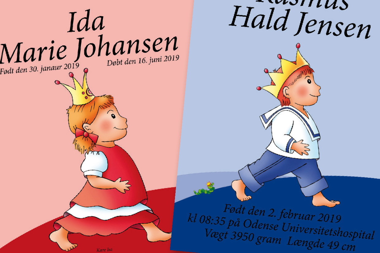 På baggrund af Babybogens flotte illustrationer har vi designet specielle plakater til piger og drenge. Dåbsplakaten fås i flere forskellige udgaver, naturligvis trykt med egne personlige oplysninger.